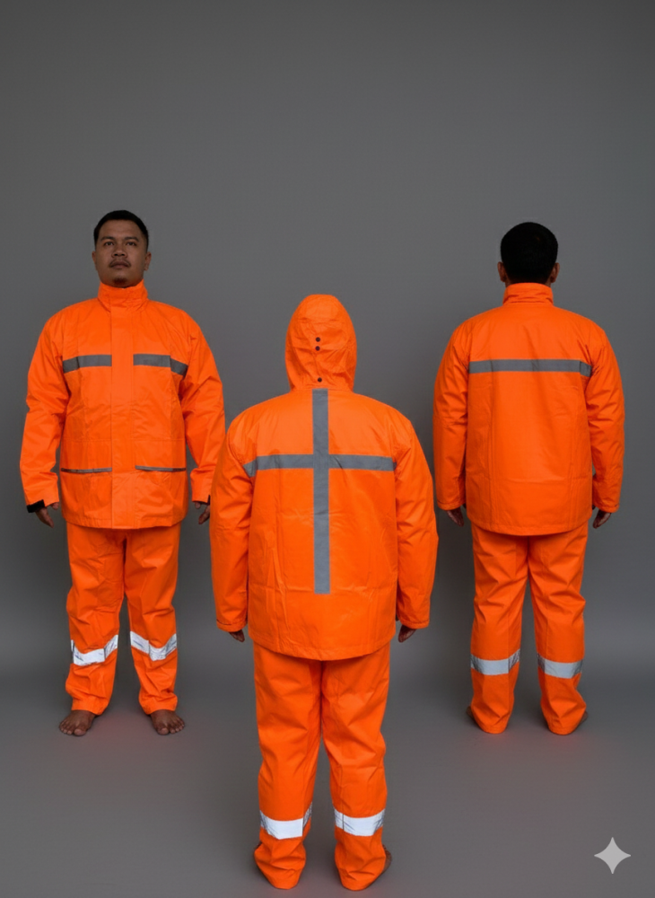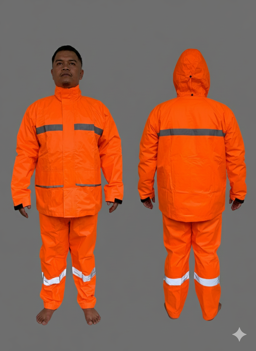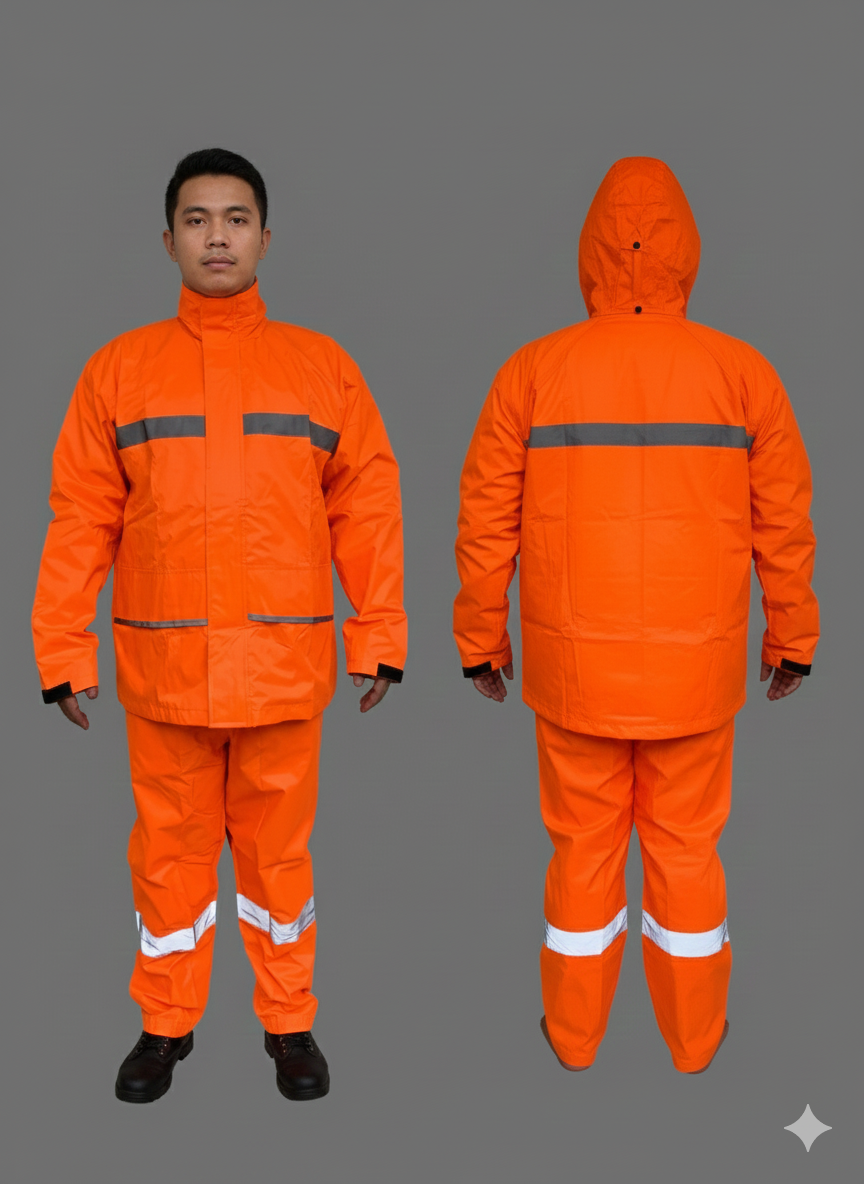Jas hujan safety warna orange tipe polos yang dirancang untuk penggunaan di area kerja outdoor, terutama pada pekerjaan konstruksi, proyek jalan, area industri, dan lapangan terbuka. Warna orange memberikan tingkat keterlihatan tinggi tanpa elemen reflektif.